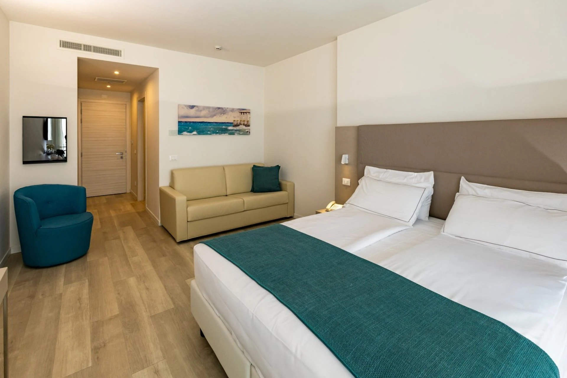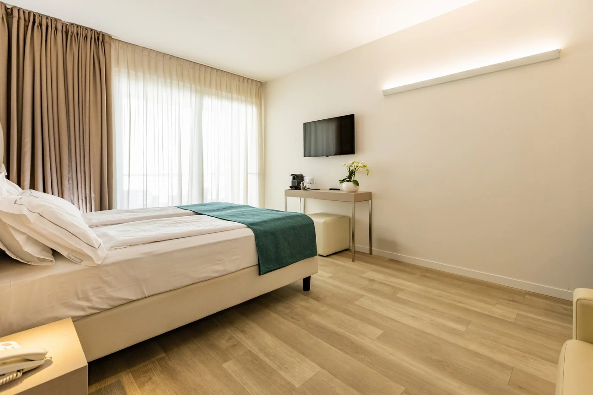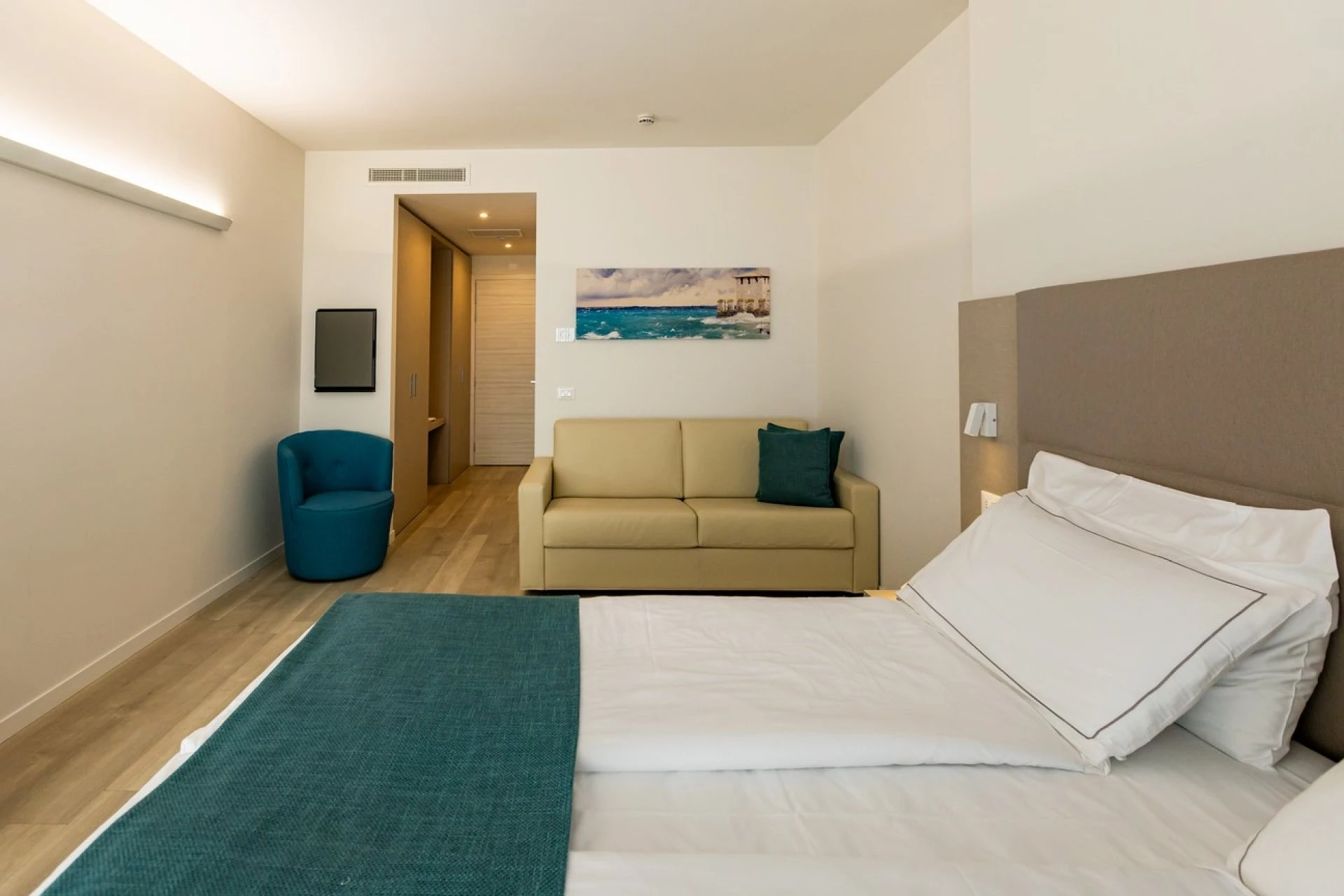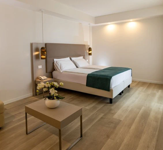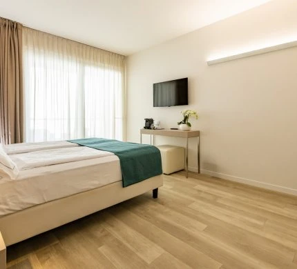 Spaziosa camera dotata di letto matrimoniale, divano letto, ed un ampio bagno moderno con doccia. Le nostre camere Superior sono caratterizzate da colori chiari, luce naturale e pavimento in legno, e dispongono inoltre di una terrazza attrezzata di poltrone e tavolino con vista lago laterale.